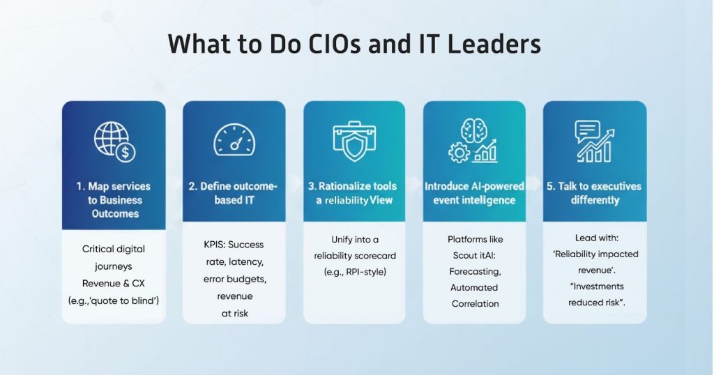 For each journey, select IT KPIs for CIOs and IT leaders that tie directly to outcomes: success rate, latency thresholds, error budgets, and revenue at risk. - Rationalize tools around a reliability-centric view